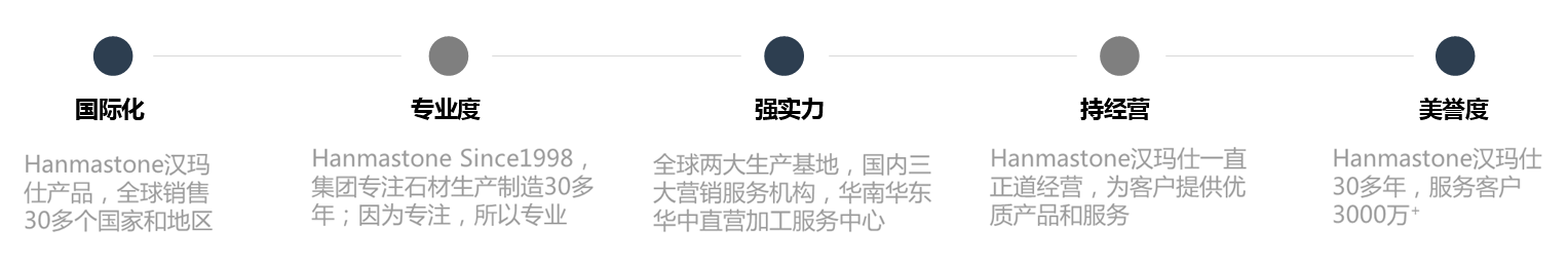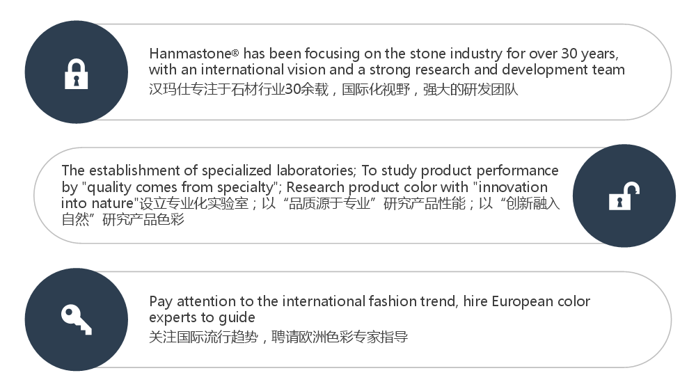 Hanmastone® with the concept of "quality comes from profession, innovation into nature", with its excellent products and design technology to drive the trend market, for customers to design a comfortable and beautiful living space, providing a variety of new high-quality environmental materials. 90% of the products are exported to Europe and the United States and other countries, cabinet industry, sanitary industry, real estate engineering, home decoration industry... Professional mesa quality service provider.